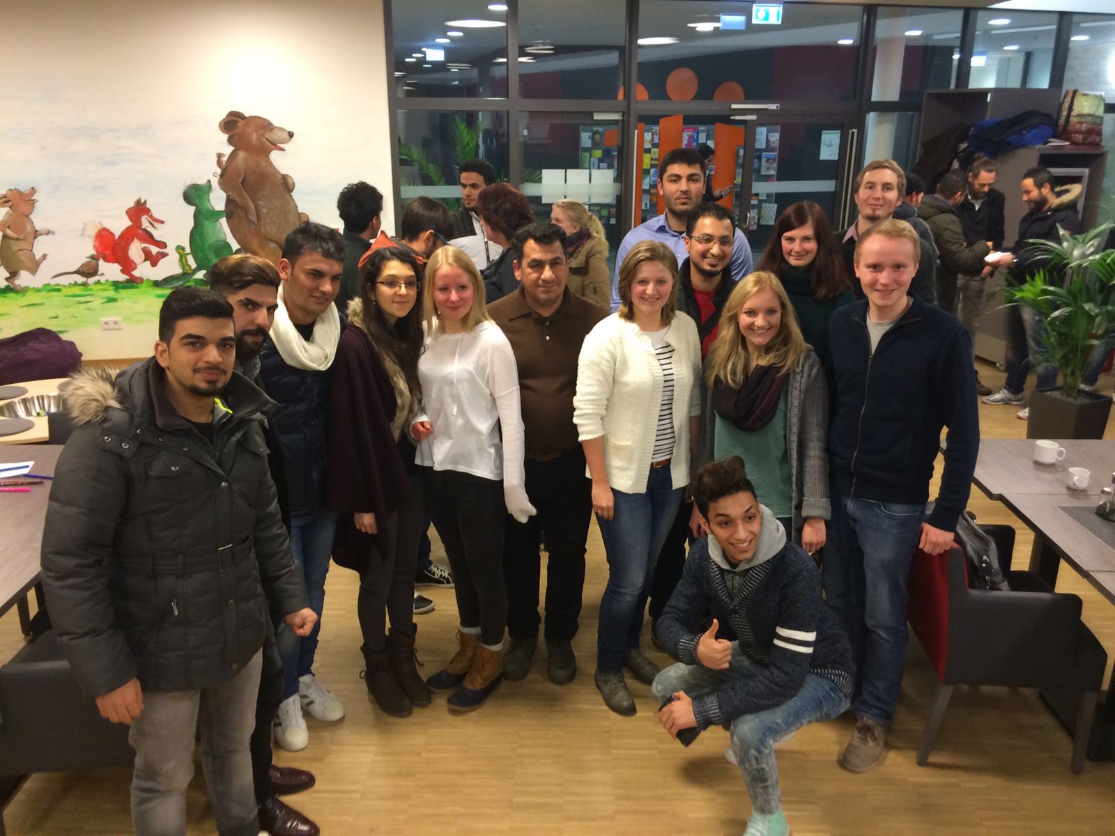 Am vergangenen Donnerstagabend, den 21.01.2016, haben wir wieder im Begegnungscafé im Familienzentrum in Aurich ausgeholfen. Dieses Mal haben wir mit den anwesenden Flüchtlingen eine Rallye veranstaltet, die aus vier Stationen bestand. Zunächst haben sich alle in kleinere Gruppen von maximal sechs Personen eingeteilt, mit denen dann an den verschiedenen Stationen gespielt wurde. So musste man an der einen Station die Anzahl von verschiedenen kleineren Objekten in Gläsern schätzen, an der nächsten gab es ein Deutschlandquiz. Des Weiteren gab es eine Station, an der die Mitspieler mithilfe eines Memory-Spiels deutsche Begriffe den jeweiligen Bildern zuordnen mussten. An der letzten Station wurde das Spiel „Dobble“ gespielt. Außerdem haben wir den Frauen und Männern die Aufgabe gestellt, anderen Mitspielern bestimmte Fragen zu stellen – zum Beispiel sollten sie eine Person finden, die mehr als zwei Sprachen spricht – und den jeweiligen Namen zu notieren. Für jeden Erfolg gab es Punkte, die am Ende addiert wurden.